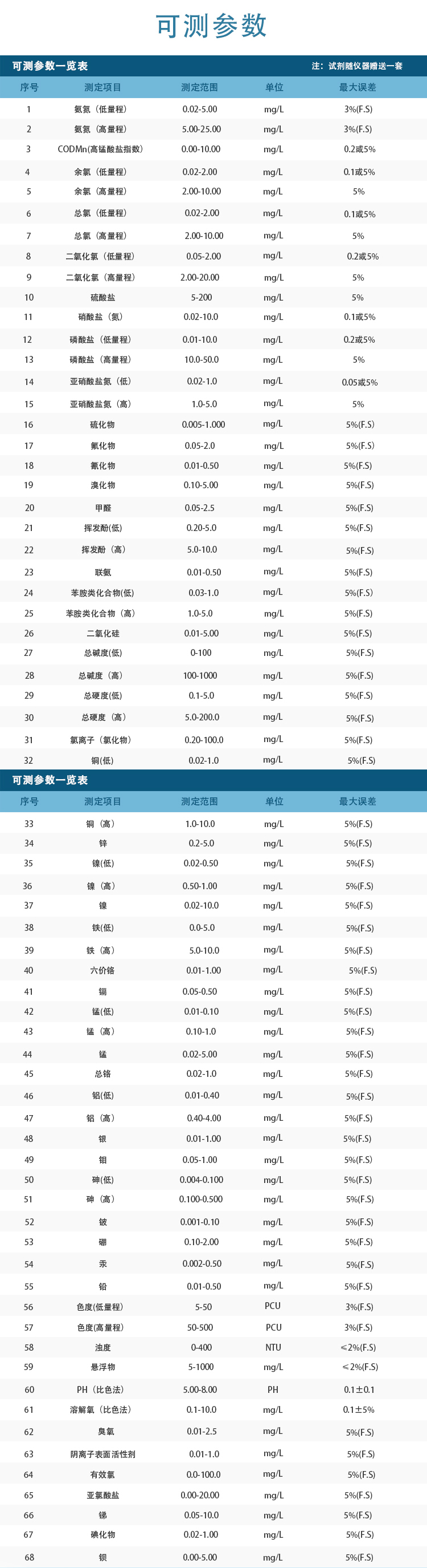 以采用進口窄帶冷光源的ERUN-ST-MU97臺式多參數(shù)水質測定儀和ERUN-SP-M9000便攜式多參數(shù)水質測定儀為例,能夠檢測COD、濁度、PH、余氯、硬度、懸浮物、氨氮、溶解氧、電導率、總磷、重金屬、溶解性總固體、色度、有機物、堿度、陰離子表面活性劑、無機鹽等參數(shù)指標,能夠適用于各種不同領域和工況場所的取樣化驗室檢測方式或戶外現(xiàn)場取樣檢測方式等快速檢測方法。